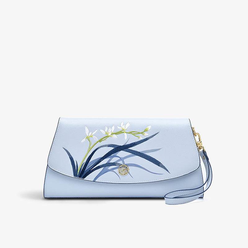 エンブロイダリーレザークラッチバッグ ブルーオーキッド エレガントハンドバッグ