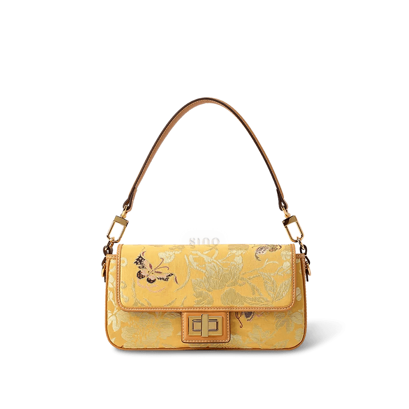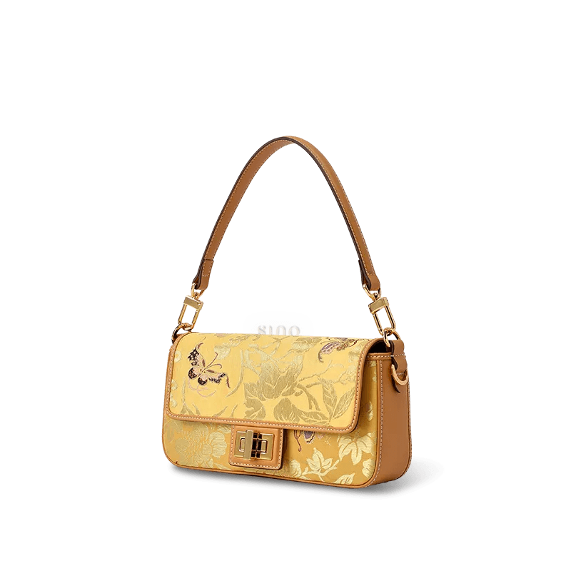 蝶の刺繍が施された豪華なYunjinブロケードレザーハンドバッグ