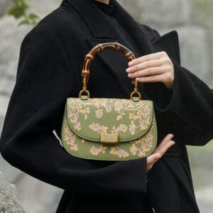 • Handcrafted Embroidery Leather Green Handbag Camellia Bamboo Handle